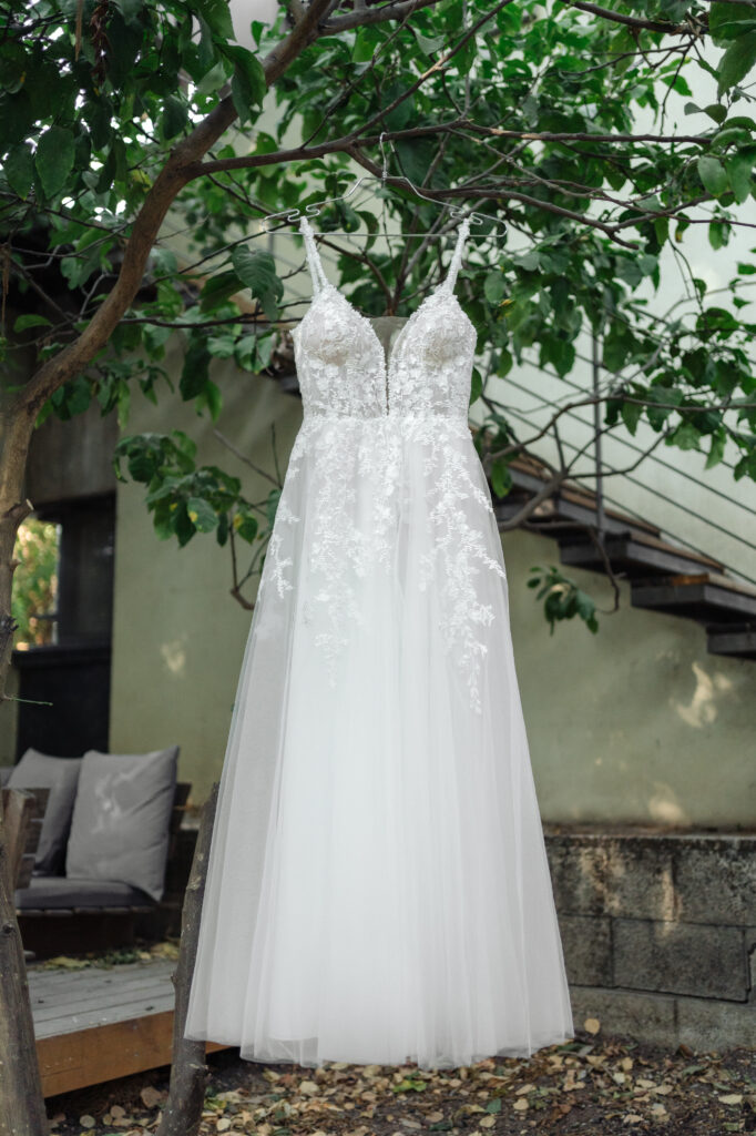 שמלה ראשונה מושלמת מקלייר כפר סבא, עם גופיות ספגטי ופתח גב נמוך ניתן להוסיף הינומה קצרה