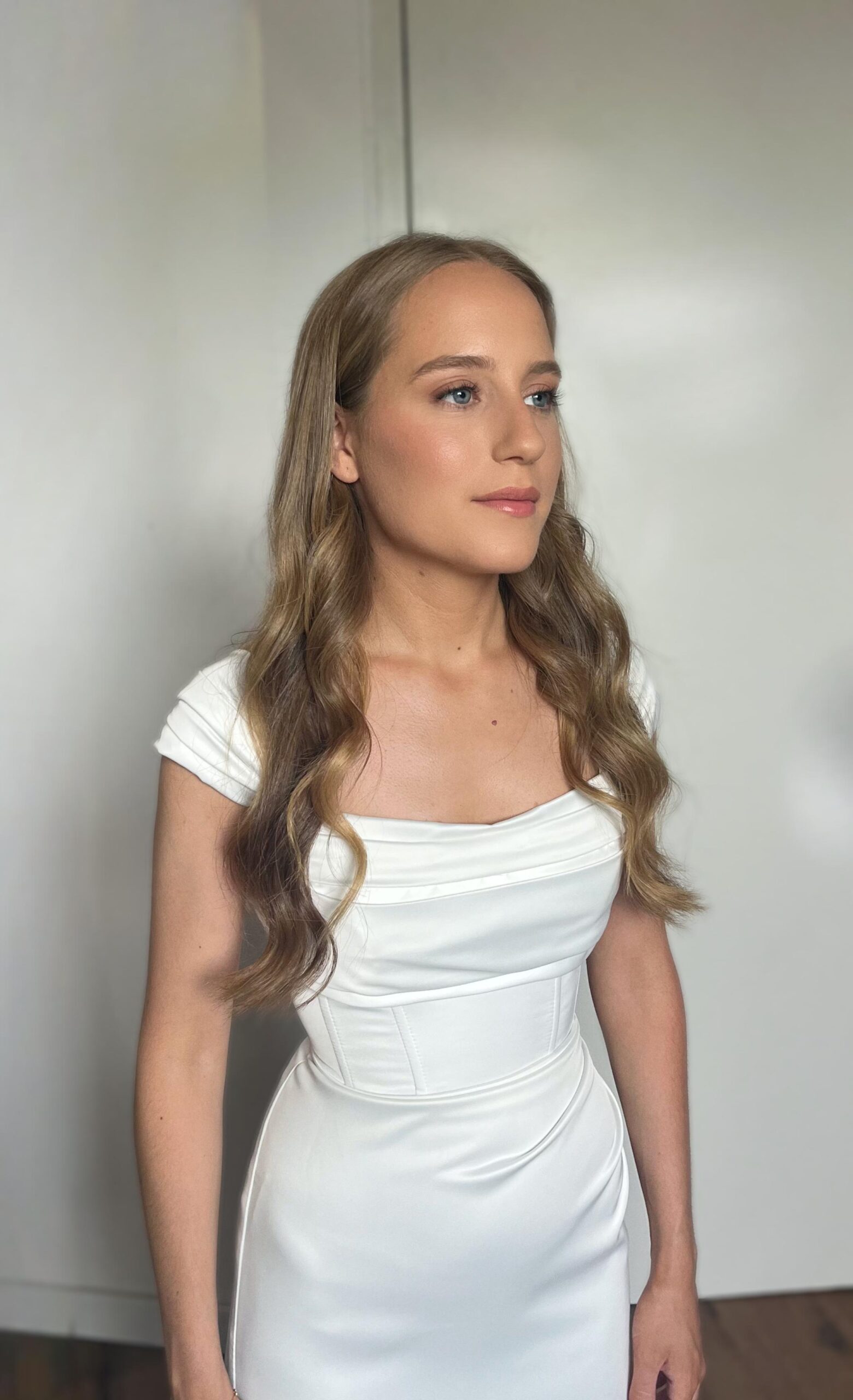 שמלה מבד סאטן עבה, בצבע חלבי, צמודה עם סשע בצד שמאל (שאפשר לפתוח ולסגור לפי הצורך)