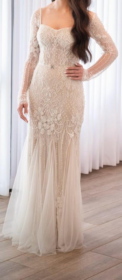 שמלת תחרה עשירה עם רקמות בעבודת יד, שילובי פנינים ונצנוץ עדין למראה יוקרתי ומיוחד.