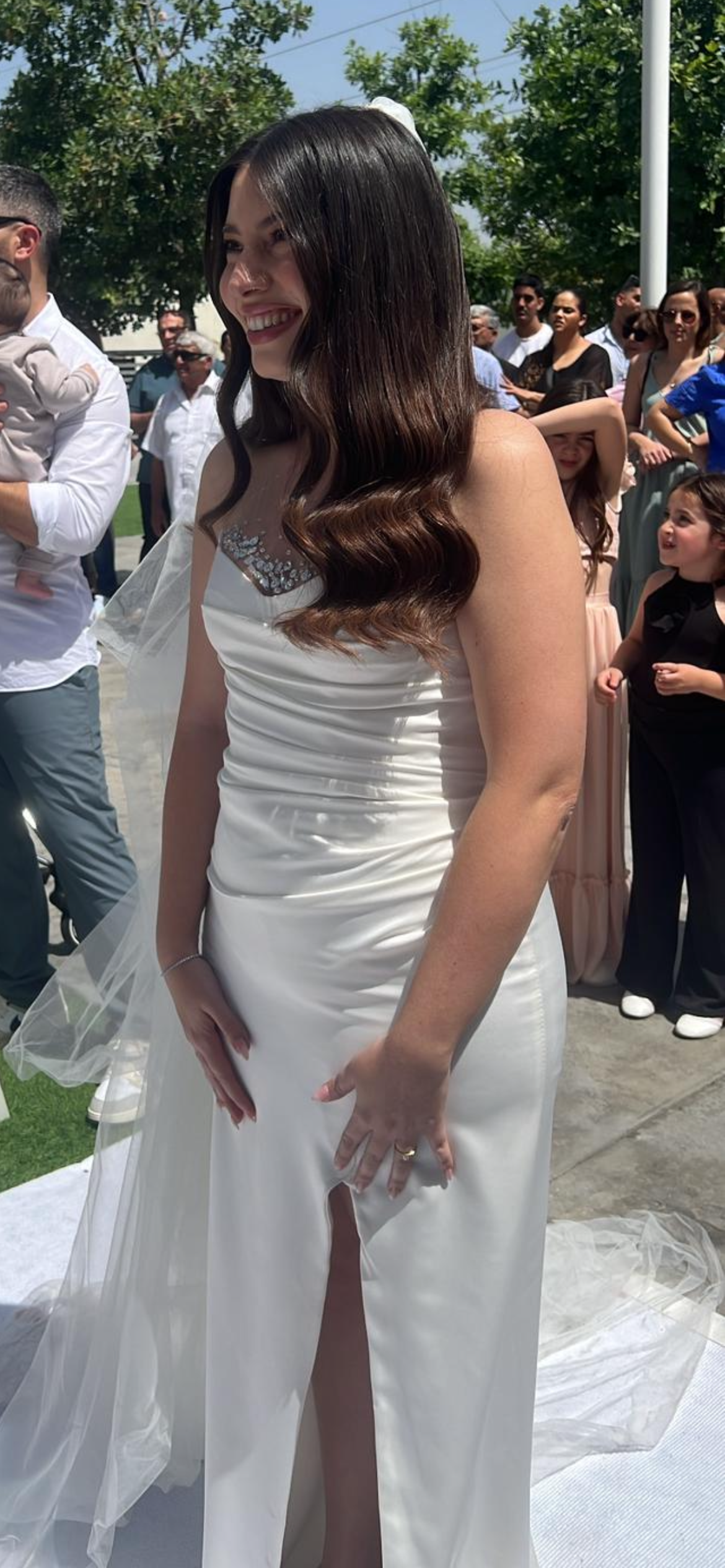 שמלת כלה של ליז מרטינז, משובצת יהלומים בחזה ועם שסע קצת מעל הברך. תתאים למידות s-m, מידה c בחזה. עברה ניקוי יבש וגיהוץ ושמורה כחדשה. שמלה קלאסית ונקייה עם טוויסט. מגיעה עם הינומה ארוכה.