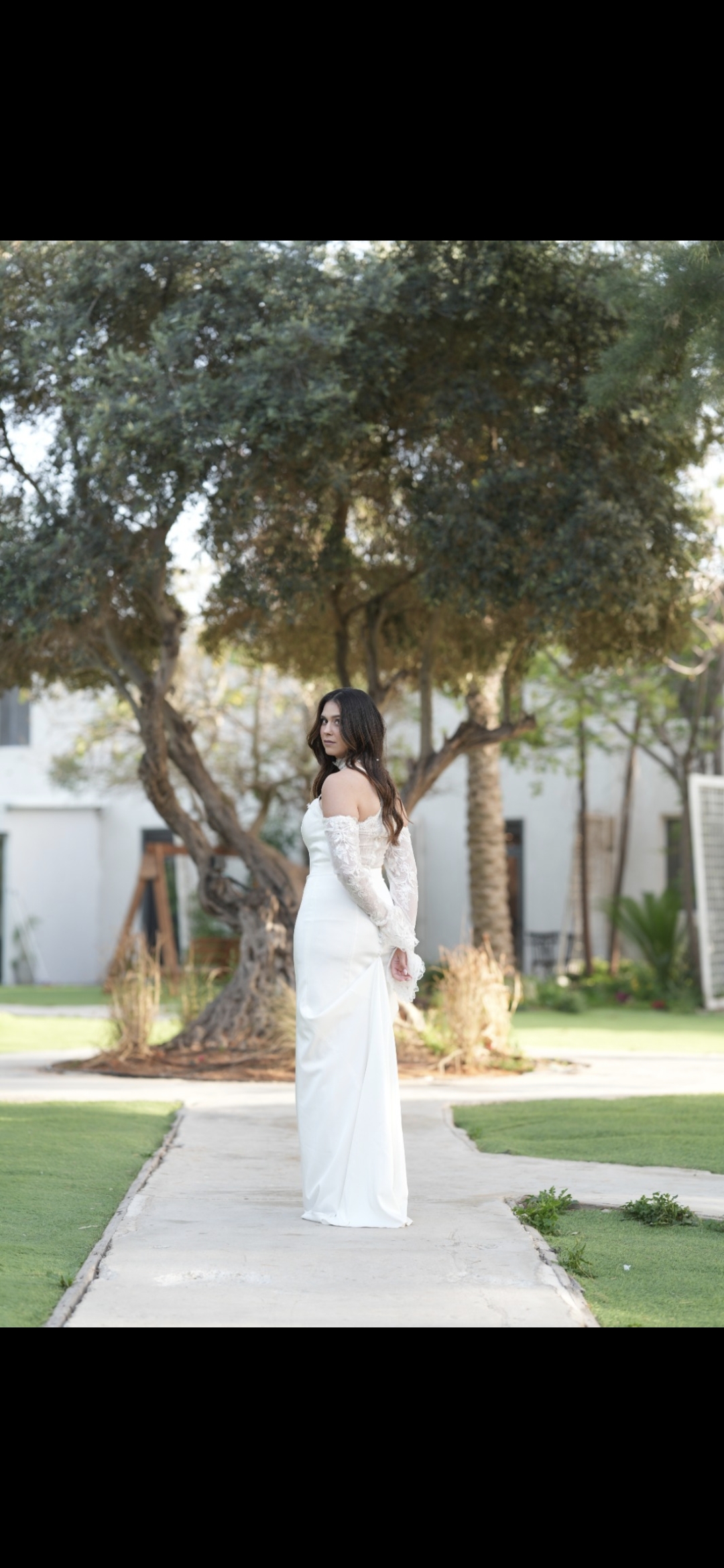 שלום, שמלת כלה מבד משי ותחרה, עם שרוולי תחרה וקולר תחרה צמוד לצוואר – אלגנטיות מובטחת.
