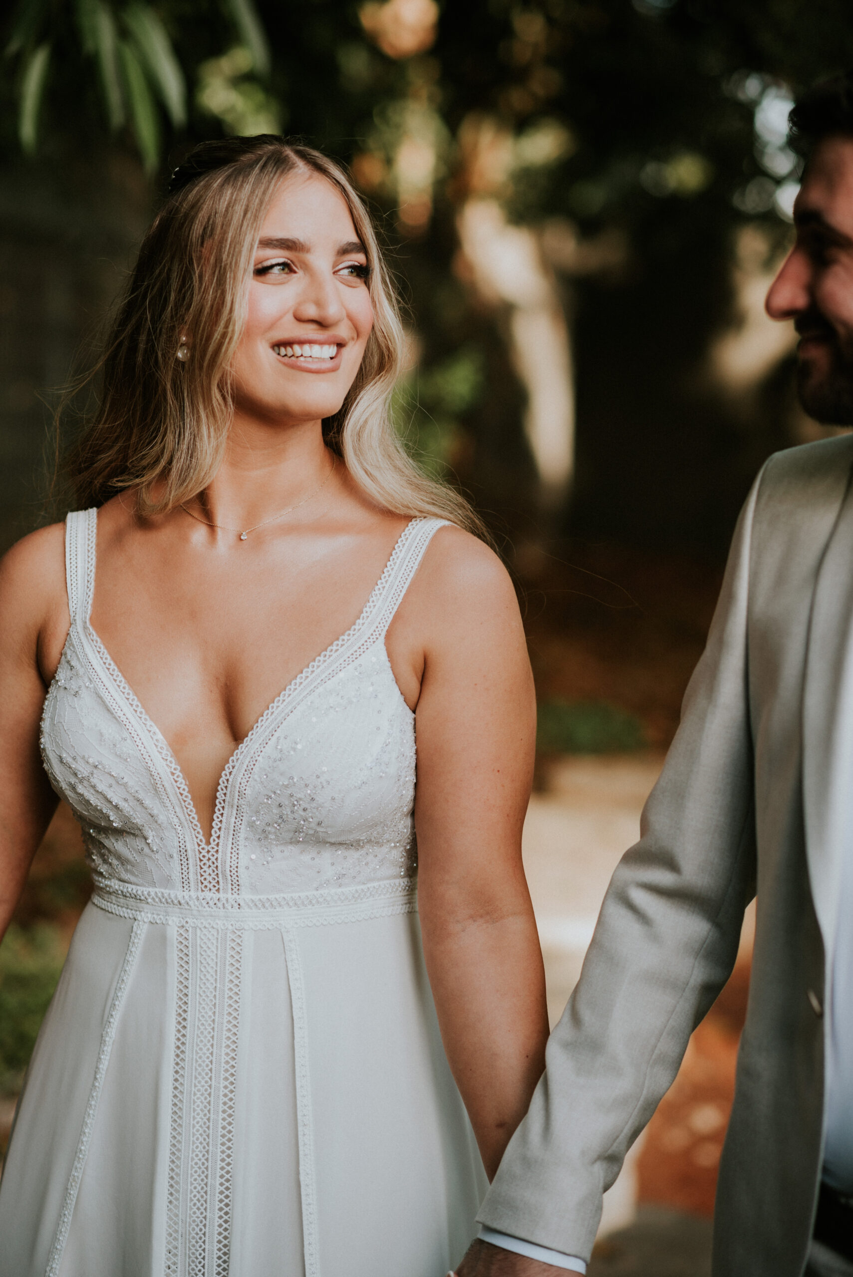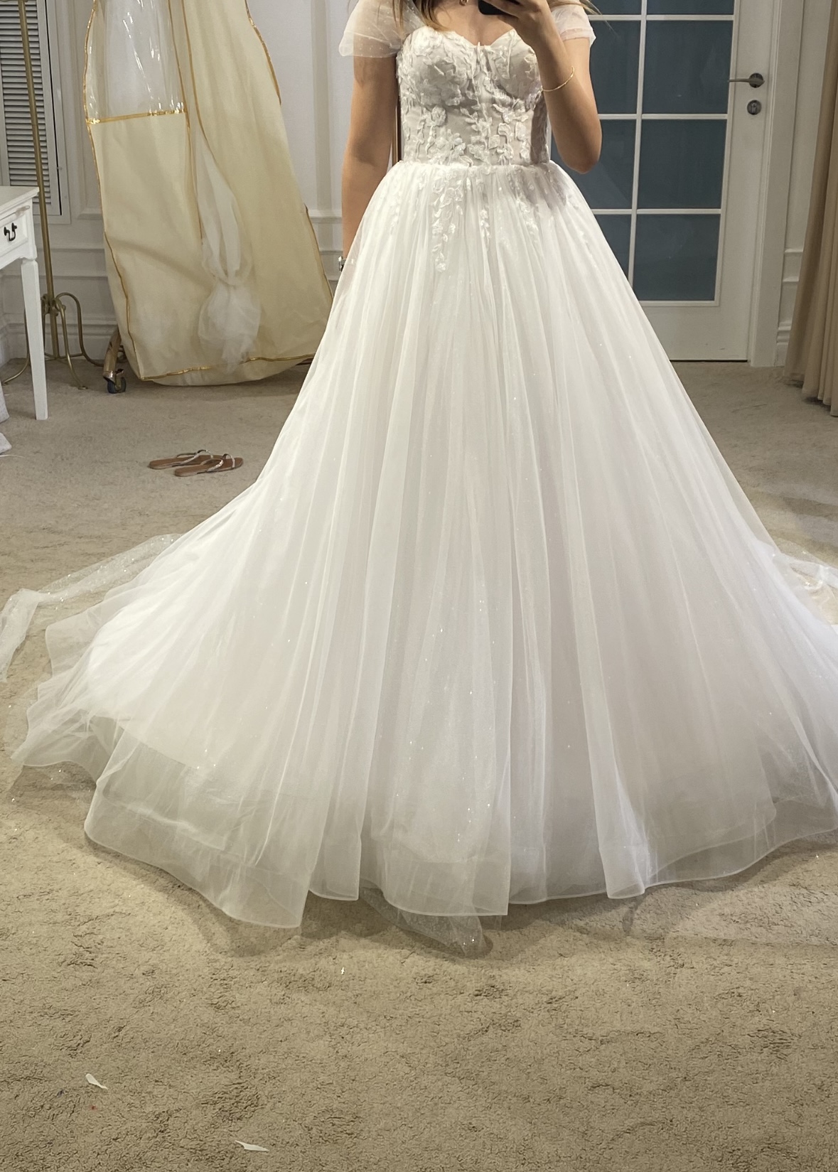 שמלה שקניתי מהמעצבת ענבר פריימן, שמלה מטול / שיפון משי, וחרוזים. לשמלה שסע קדמי, ומחטב פנימי בסגירת טיקטק. השמלה עברה ניקוי יבש.