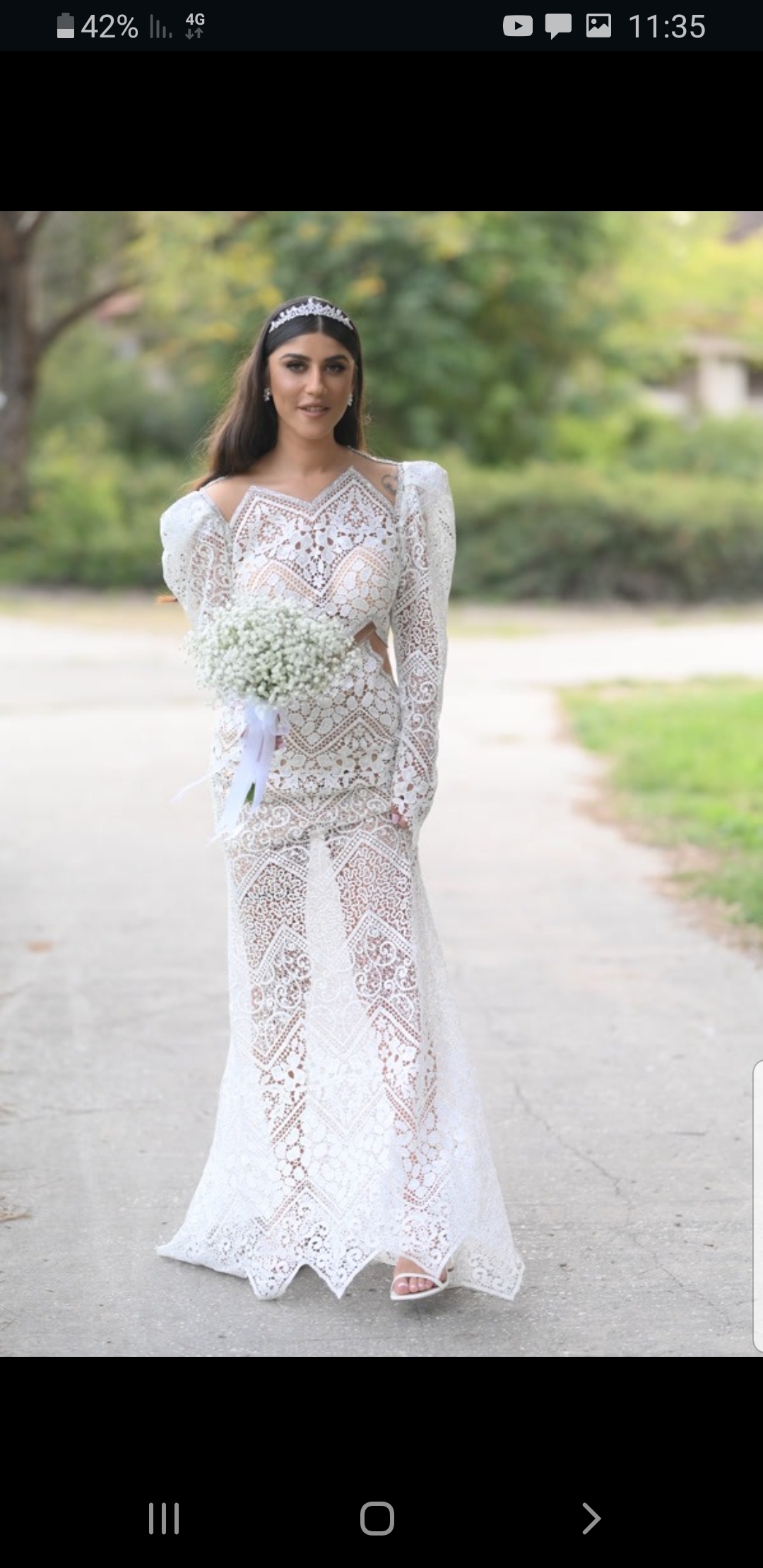 השמלה מגיעה עם הינומה , וקולר שנשפך על הכתפיים , עשוי גם הוא מ-טול עם תיק תק נסגר מסביב לצוואר .