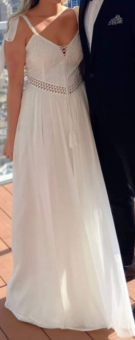 שמלה של אלון לבנה דגם Bella עם הינומה עם שובל ארוך.