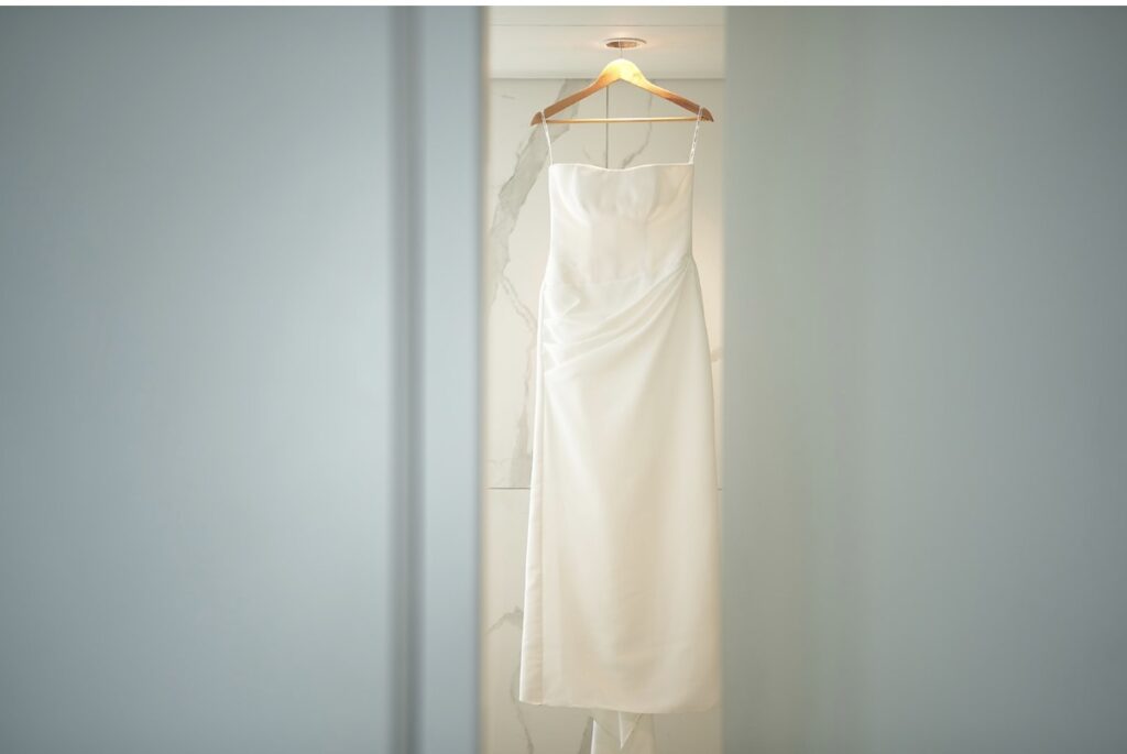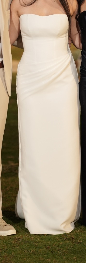 שמלה קלאסית עם מחוך, עדינה ולבנה מבד קרפ בעיצוב אישי. יש שובל קצר