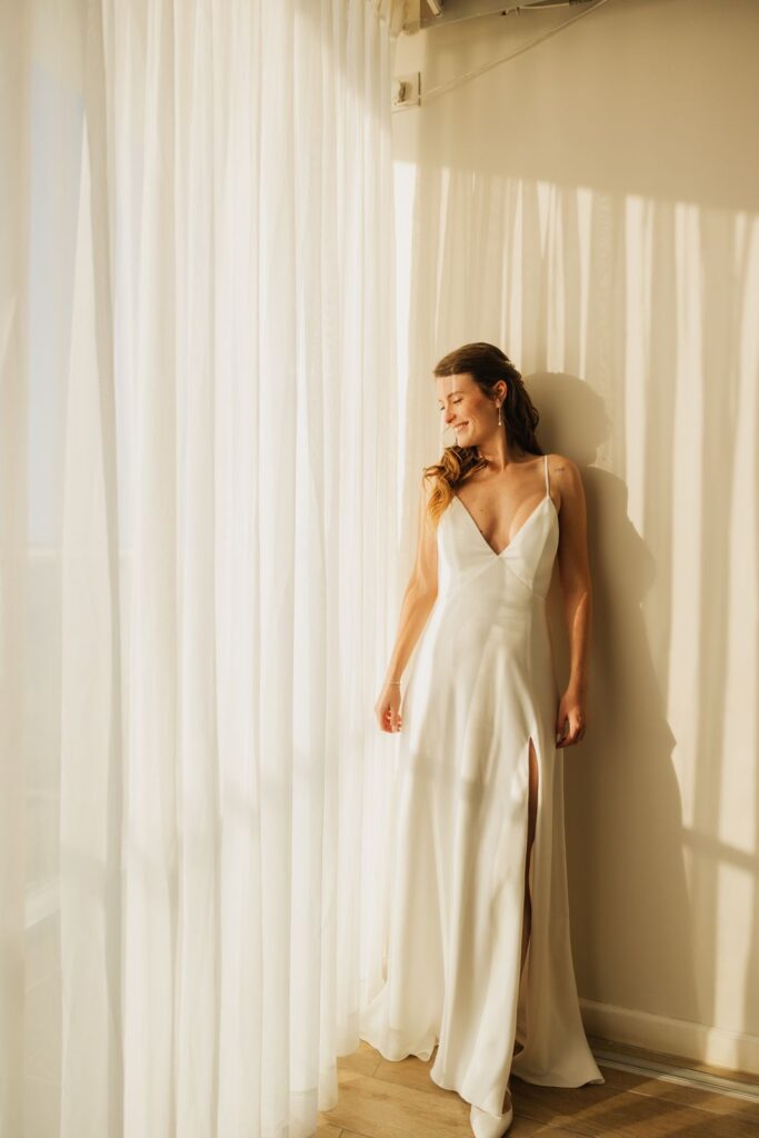שמלה קלאסית של סימפלי יו, בד סאטן שיושב בול על הגוף, בעלת מחשוף וי מקדימה וגב פתוח עם קשירה.