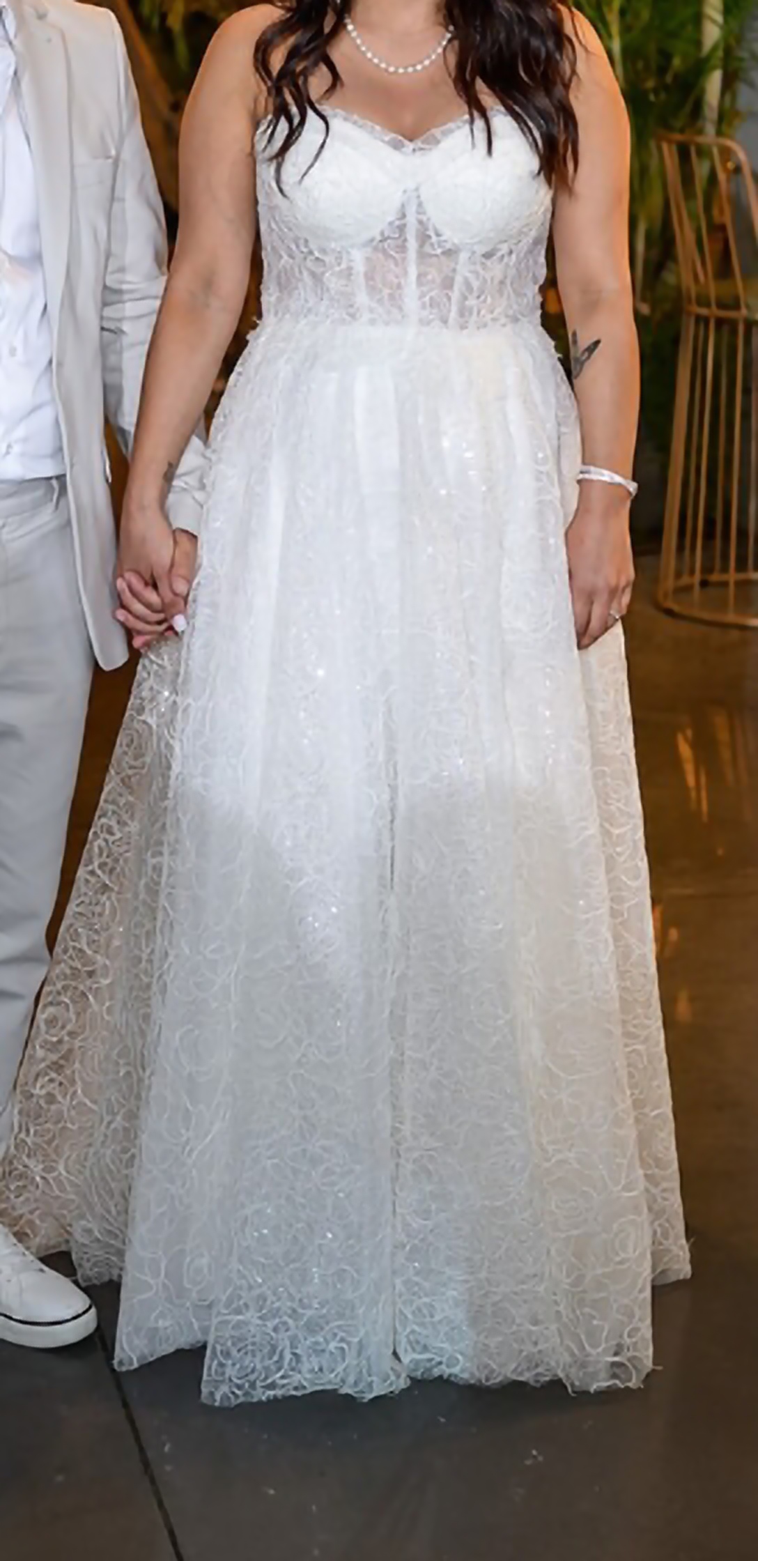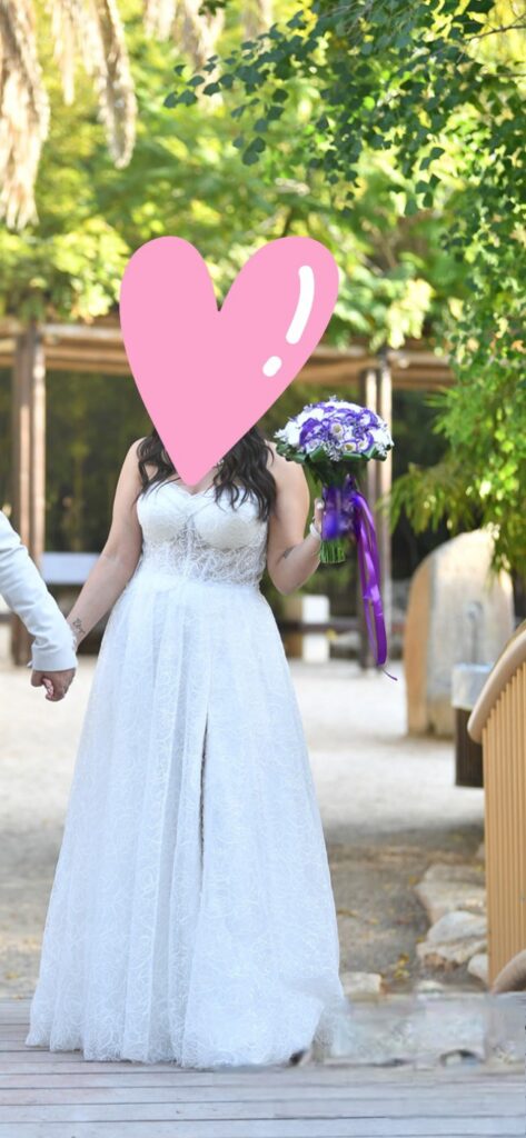 שמלת מחוך חדשה, נתפרה במיוחד בשבילי, עם תחרה, שסע לא עמוק מדי. מחיר כולל הינומה ארוכה
